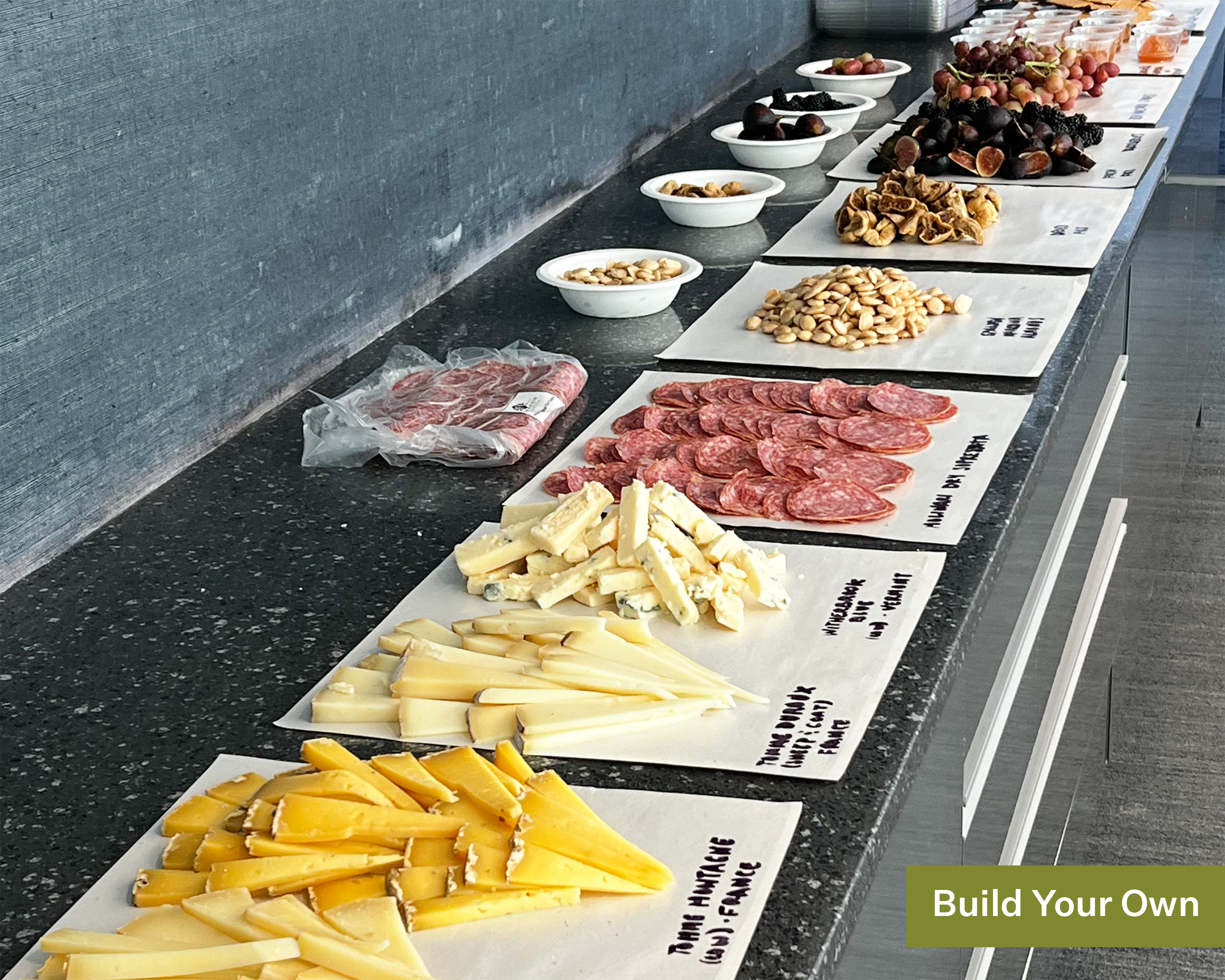 - Each participant gets an individual cheese and charcuterie board with a selection of 4 cheeses, salame, prosciutto, 2 condiments, chocolate, and crackers.