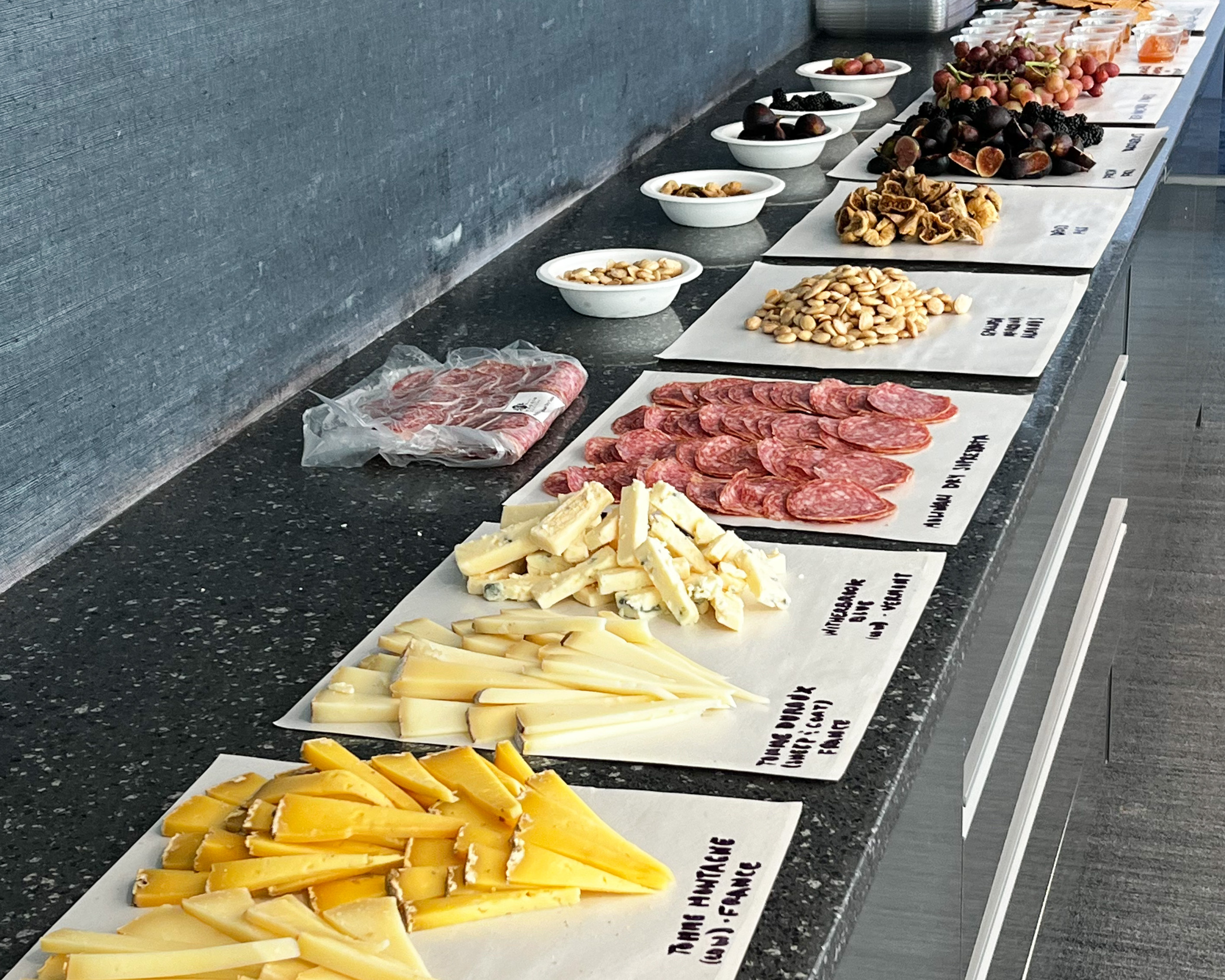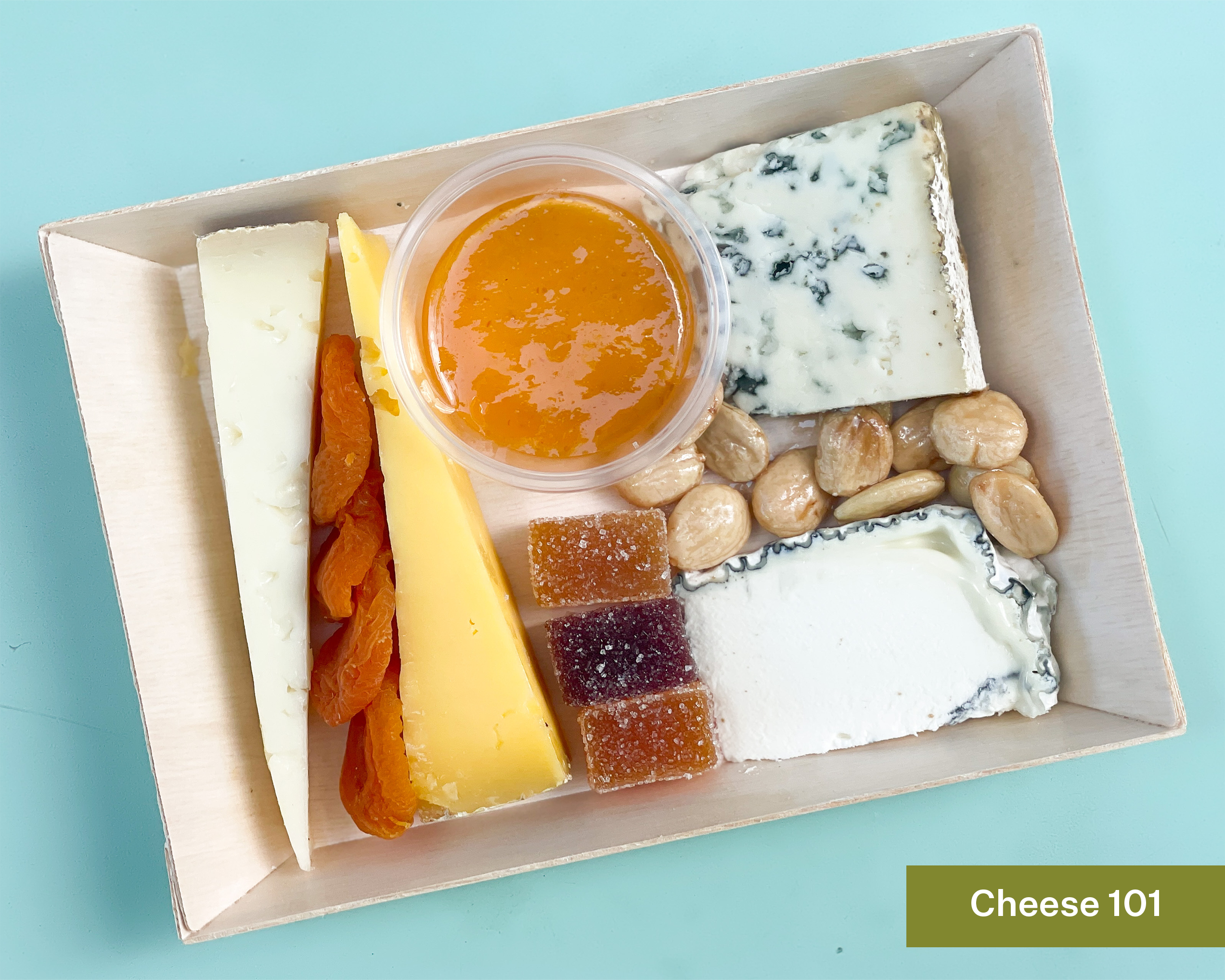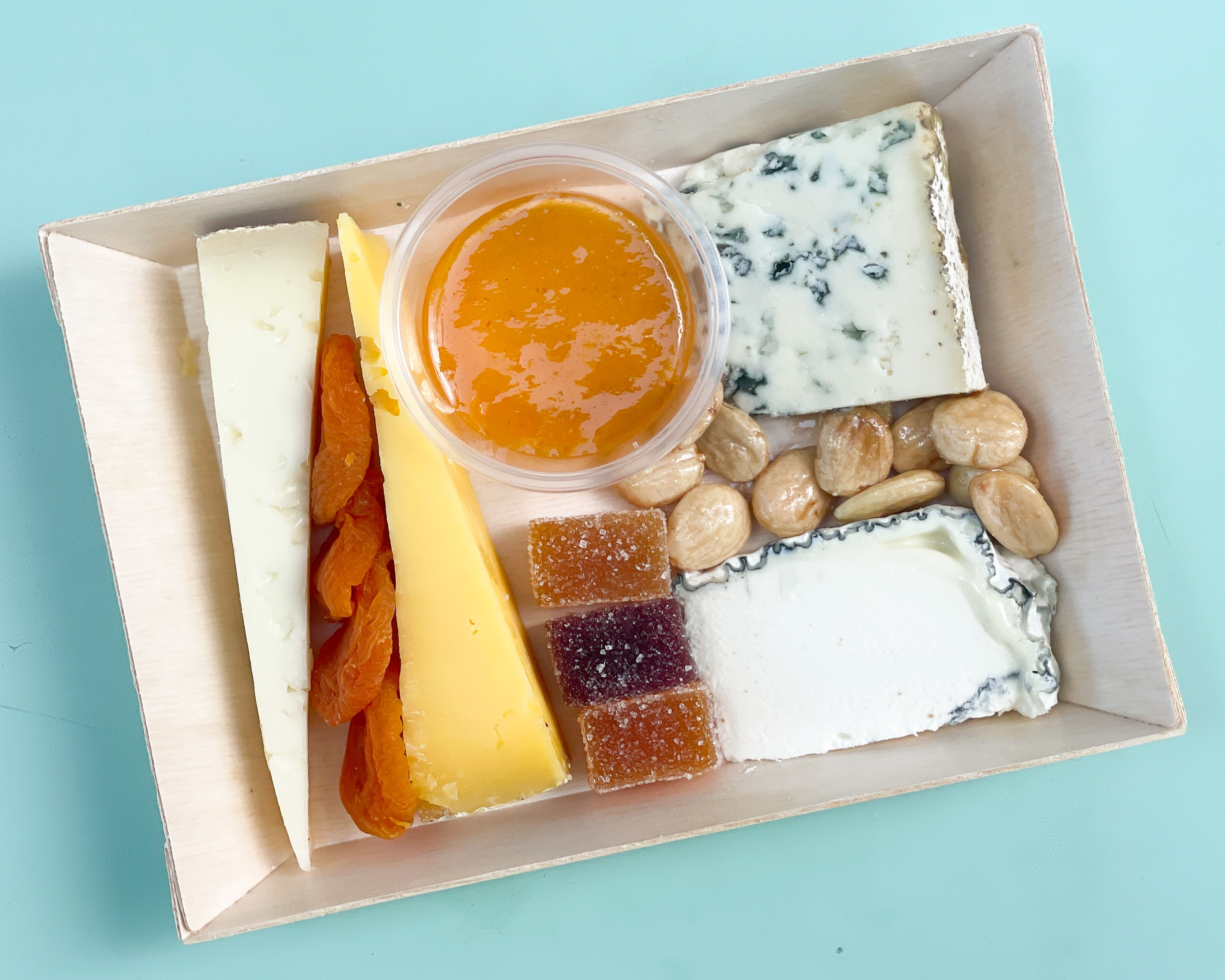 - Each participant gets an individual cheese board with a selection of 4 cheeses, Marcona almonds, pâte de fruits, dried apricots, a jam, and crackers.